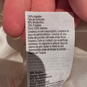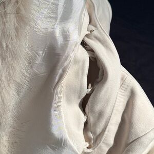 Elevate your style with this elegant cream jacket featuring a luxurious faux fur collar. Perfect for adding a touch of sophistication to any outfit. Outer is Cotton, 10% polyester, lining is Viscose contrast is Modacrylic ( see photo), tiny stain on inside flap at bottom/ below zipper ( see photo)
