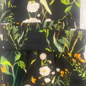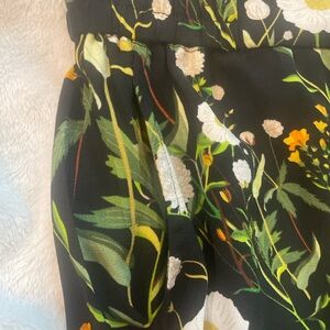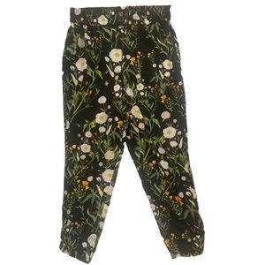 Elegant black pants featuring a colorful floral pattern. Includes white, yellow, and green details. Elastic waistband and ruched hem on the pant ends. Has pockets.