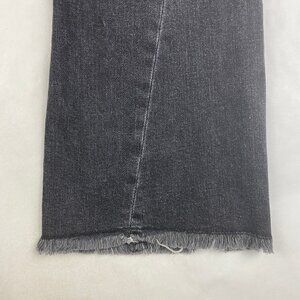 Black flare jeans featuure button and zipper closure, raw fringe hem, pockets.