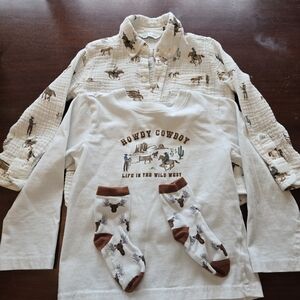 Charming cowboy-themed shirt set. Includes a white long-sleeve tee with cowboy print and a matching button-down shirt + moose socks. Perfect for playful adventures.