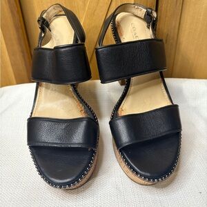Shoes have some cosmetic damage on the foo bed. Still a great shoe. just needs footbed replaced. Black leather sandals by Coach. Features a stylish strap design. Ideal for versatile wear.