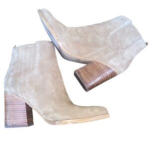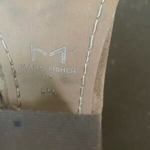 Embrace a sleek and minimalist style with these Marc Fisher tan ankle booties. Crafted from luxurious suede, they feature a pointed toe and subtle heel, offering a modern twist on a classic western-inspired design. Perfect for adding a touch of elegance to any outfit.