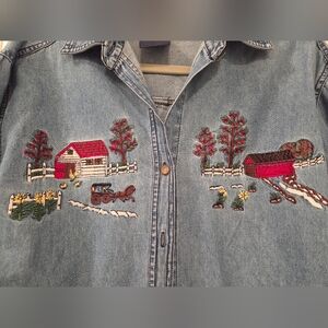 Women's Vintage Denim Shirt with Embroidered Farm Scene