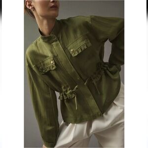Why we ❤️: We love the juxtaposition of utility jacket with feminine details like small ruffles and cinching waist