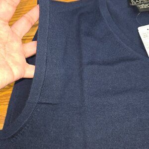 This sweater vest from Jos Bank Traveler Collection is made from 100% Merino Wool. It's a V-Neck style in Navy with ribbed neckline and bottom (no sleeves). It will keep you warm and stylish! It's new with tags and a size M. The perfect find to buy for yourself or gift to someone else.