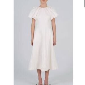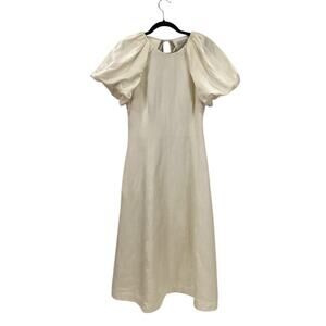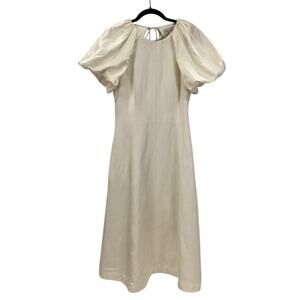 Keywords: classic, casual wedding dress, reception dress, engagement party, bridal, photo shoot, gala, simple, elegant, timeless, modern, midi, puff sleeve, pockets, back zip closure, flattering, breathable linen, off white, designer, luxe, quiet luxury