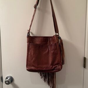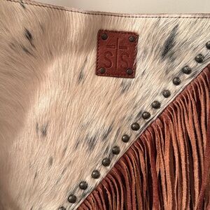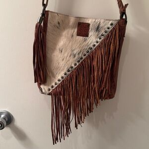 Brown and Cream Fringe Cow Print Shoulder Bag…..used once.