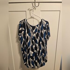 Chic short sleeve top with a bold leaf pattern. Features a blend of blue and black hues. Ideal for casual outings. only worn a couple of times.