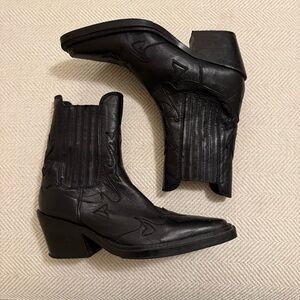 Size 6 with a stretch ankle. Worn once to a rodeo bar. Some scuffs on the toes of the boots and some wear on the heels but overall in good condition. Really nice quality made boots.
