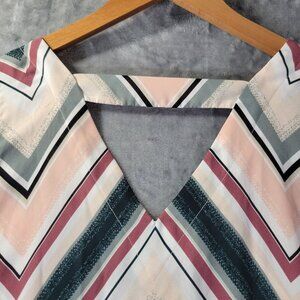 Maurices women’s sleeveless chevron stripe blouse in size XL. Features a chic back bar detail, lightweight flowy fabric, and multicolor pink, gray, and white striped print. Perfect for layering or summer wear.