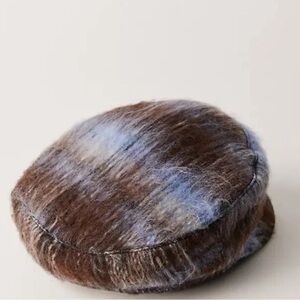 Chic fuzzy cap with a cozy feel. Features brown and blue tones.