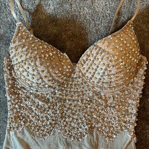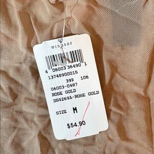 New with tags sequins beaded bodysuit by Windsor, size medium. Sold out online. Padded cups with adjustable straps. Pearls, sequins and beads throughout the chest. Sheer mesh back. Thong bottom with button closure. Runs true to size.