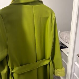 Bright lime green jacket with plush faux fur trim. Stylish and cozy for cool weather.