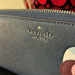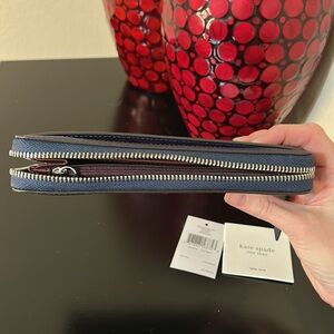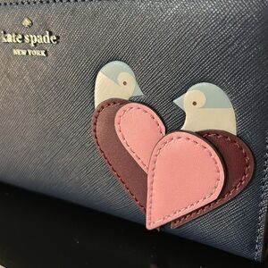 kate spade, kate spade new york, love birds wallet, large continental wallet, zip around wallet, navy leather wallet, bird appliqué, limited edition kate spade, NWT wallet, designer wallet, women’s accessories, gift for her, luxury wallet, statement accessory, travel wallet