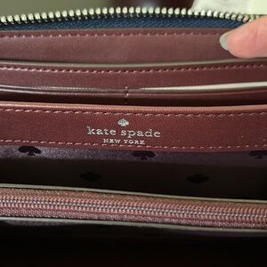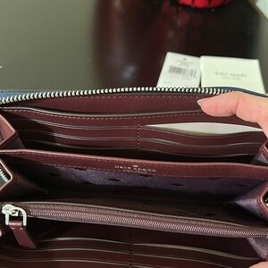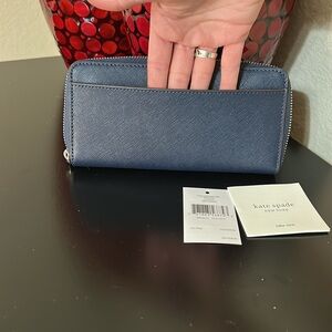 Wallet is brand new with tags. Exterior is a navy color with the lovebirds embellishment on the front. Pin mount logo with silver toe hardware. Interior is a deep berry color. Interior feature is a zipper coin compartment. In addition to 12 card slots and two long pockets.