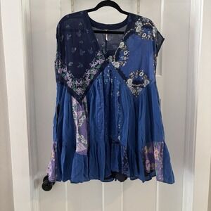 The Free People Mended with Scarves Colorful Patch Pieced Mini Dress in size Small is a vibrant and stylish piece perfect for women looking for a statement dress. The trapeze and swing style offers a flattering silhouette, while the mixed printed design adds a fun and colorful touch to the outfit. With a short dress length and a blue color palette, this dress is ideal for those who want to make a fashion statement. Made by the popular brand Free People, this dress is sure to be a standout addition to any wardrobe.
