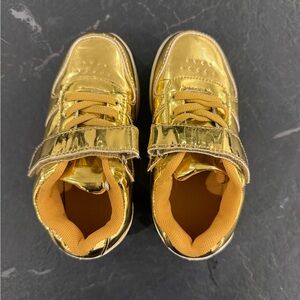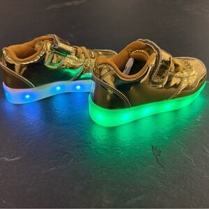 Shiny gold child shoes size 27 European. Size 10/10.5. Has dual charging cord included to charge both shoes at same time.