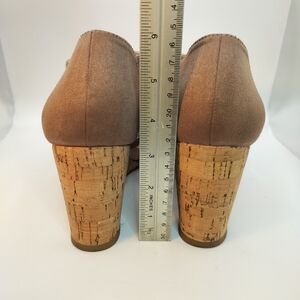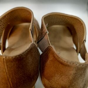 Great preowned condition! Floral perforated design on fabric upper, elastic band for slipping on, cork wedge heel, cushion sole. Great summer casual shoe in neutral brown / tan colorway.
