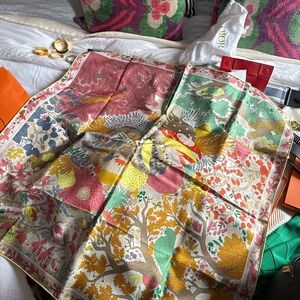 Vibrant silk scarf with intricate design. Features red, yellow, green, and cream hues. Perfect for adding elegance to any outfit. Hermes brand new 2025 never used with box and bag. Bought in Paris at the original flagship store
