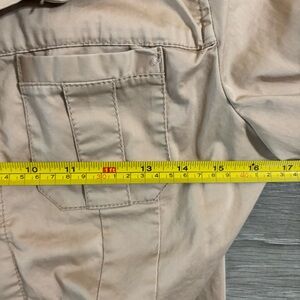 96% Cotton/4% Spandex. Has roll up sleeves to button and is a fitted/snatched look. Pit to Pit is approx 17 inches and overall length is approx 23 inches. Comes from a pet and smoke free home!