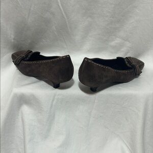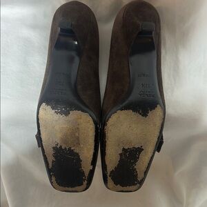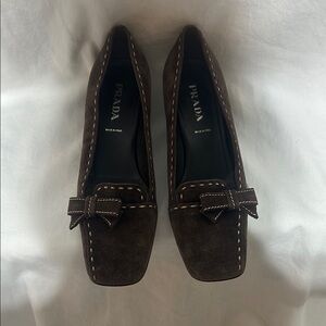 Elegant dark brown suede loafers by Prada. Features a stylish bow accent. Ideal for versatile wear. Really super tiny cute heel.