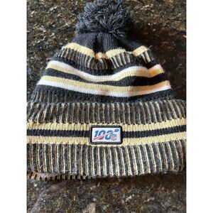 This New Era cuffed beanie with pom is designed for unisex adults and features a multicolor design. It includes an embroidered Saints logo patch and an NFL 100th season patch. The beanie is fleece-lined for added warmth, making it ideal for casual winter wear. Made from a blend of acrylic, polyester, and wool, it has a solid pattern and knit fabric type. The beanie is one size fits most and originates from China. It is pre-owned.
