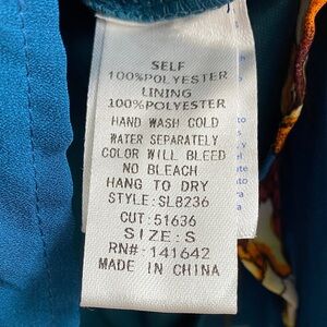 Chic romper with floral design. Features bell sleeves and tie front. Low cut front with tie at waist. Back is open with button at top. Zipper. Lined. Excellent condition!