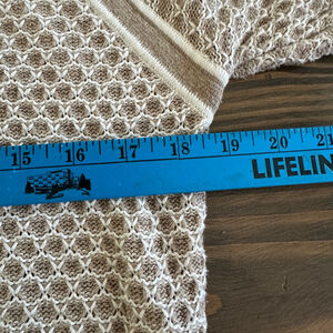 This pre-owned Banana Republic crew neck sweater in size L features a cozy beige and white open-knit design with classic raglan sleeves. The long sleeves and hem are finished with ribbed trim for a comfortable, relaxed fit. The white stripes on the sleeves add a subtle sporty accent.