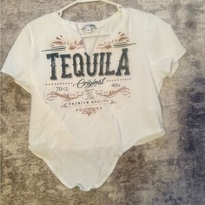 Trendy crop top with bold 'Tequila' graphic. Features orange and black lettering. Perfect for casual wear.
