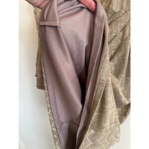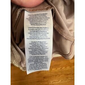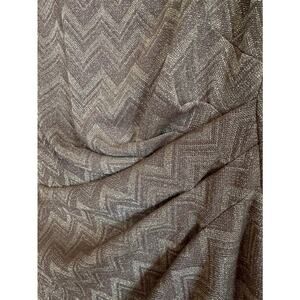 Elegant Chaps sleeveless sheath dress in a taupe / champagne metallic chevron knit. Features flattering side ruching and a structured silhouette that works well for events, work functions, or dressy occasions. Fully lined with back zipper closure.