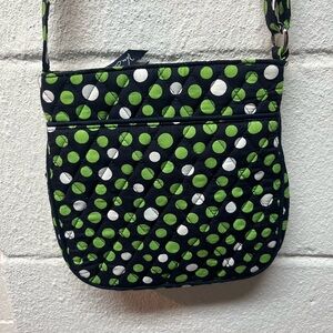 Stylish and vibrant, this Vera Bradley bag features a playful green and navy polka dot design. Perfect for adding a pop of color to any outfit. Roughly 8x8in