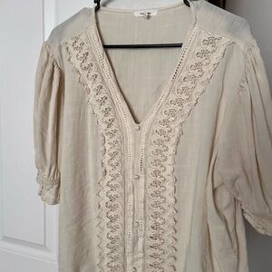 Chic ivory blouse with intricate lace trim. Features a button-down front. Ideal for versatile styling.