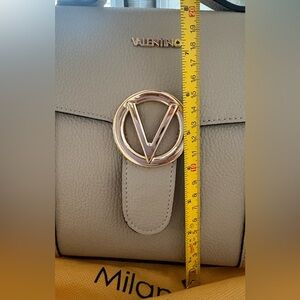 Stylish Valentino leather bag in tan with suede sides and interior. Features a gold logo accent. Straps included for crossbody, Perfect for versatile wear.