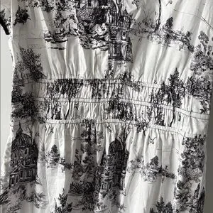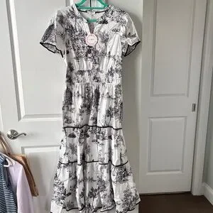 Chic midi dress with a classic toile print. Features a flattering silhouette and short sleeves. Ideal for casual or semi-formal occasions.
