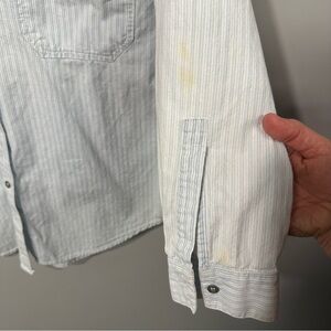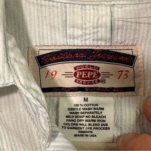 2. Pepe Jeans Co - vintage white grey stripe logo embroidered button up shirt. 100% cotton. Shirt has a small very light brown stain on back side of arm (see last photo). Tag says medium. Underarm - underarm measurement = 23”