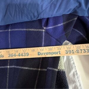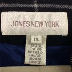 4. Jones New York Y2K blue and black plaid jacket. Tag says size 14, will fit a large. Underarm - underarm measurement = 21”