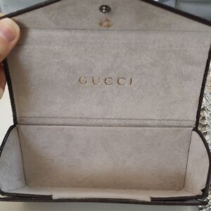 Elegant leather Gucci sunglasses holder with signature embossed pattern. Deep brown hue.