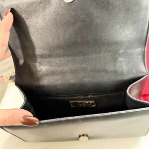 Chic black handbag featuring a textured design. Gold chain adds a touch of elegance.