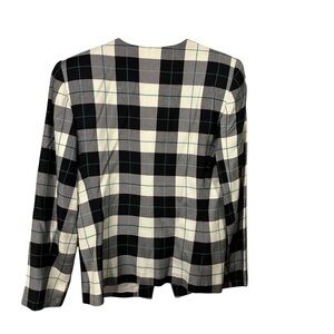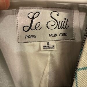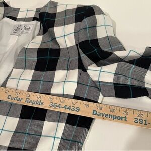 2. Le Suit size 8 vintage black white teal plaid collarless blazer. Business, Officecore - see underarm measurements in photos.
