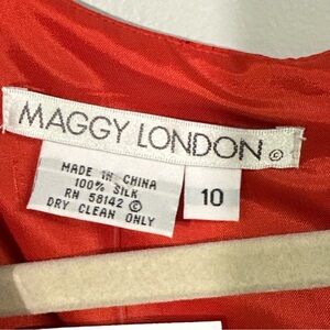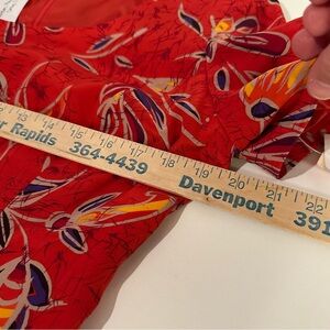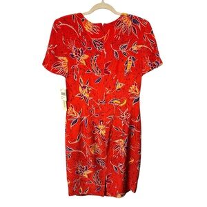4. Maggy London red silk tropical floral batik print dress, size 10. see underarm measurements in photos.