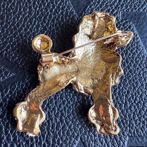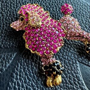 This beautiful brooch features sparkling pink and black faceted crystals on a gold tone poodle dog. The brooch also has a loop on the back so it can be hung on a chain and worn as a pendant. Such a lovely statement piece!