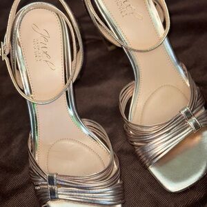 Elegant metallic heels with strappy design. Perfect for evening wear. Asymmetric vamp straps create modern dimension on a metallic leather sandal balanced by an angular square toe and flared block heel.