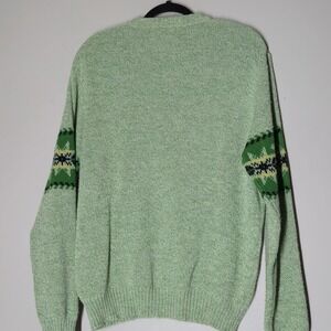 This vintage 80s John Deere sweater for men in size Large features a tight knit design in green acrylic material. The sweater has a classic crew neck and long sleeves, making it perfect for casual occasions in winter, fall, or spring. With a Fair Isle pattern and John Deere logo accent, this pullover sweater embodies the theme of outdoor activities and American farming heritage, ideal for those who appreciate retro style and quality craftsmanship.