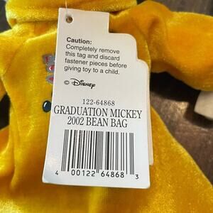 Disney Vintage 2002 Graduation Mickey Mouse Yellow Bean Bag Plush Doll Cap Gown. New with tags. Very rare and purchased from Walt Disney World. Approximately 9 inches tall.