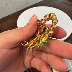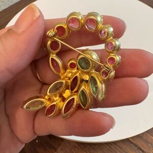 This elegant brooch features stunning pink and green stones, perfect for adding a touch of glamour to any outfit.