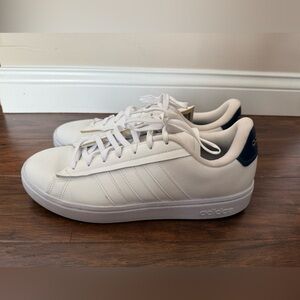 Classic Adidas casual Tennis inspired sneakers in white with navy accents. These are very gently used, maybe worn twice and are in excellent condition. Synthetic and leather upper with a comfort cushion footbed. Stylish and comfortable for everyday wear. All of my items are well cared for and come from a smoke free home. Check out my other items