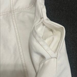 Stylish long white denim jacket by Frye. Features button-down front and chest pockets. Ideal for layering.
