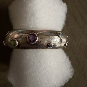 Cuff has peridot, amethyst and blue sapphire and pink tourmaline stones set in 925 sterling silver