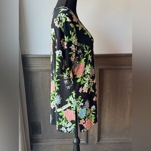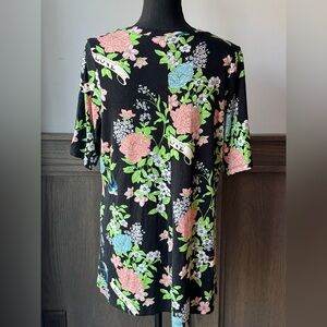 This Torrid tunic features a relaxed fit with a striking black base adorned with a vibrant green floral pattern. The short sleeves and soft, flowing fabric make it a comfortable and stylish choice for any casual outing. Its V-neck design adds a touch of elegance to this versatile top.