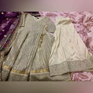 Elegant cream dress with intricate purple embellished dupatta. Perfect for special occasions by Pakistani designer ASIM JOFA.. Worn once for few hours